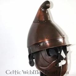 This is a replica of a Roman helmet excavated in Weisenau, city of Mainz. The original dates from approx. 50-75 AD and is exhibited in Worms, Germany. This galea helmet is provided with a crest and was worn by the optio. This Roman helmet is made of 1,3 mm thick steel. It is suitabe for a head circumference up to 62 cm.