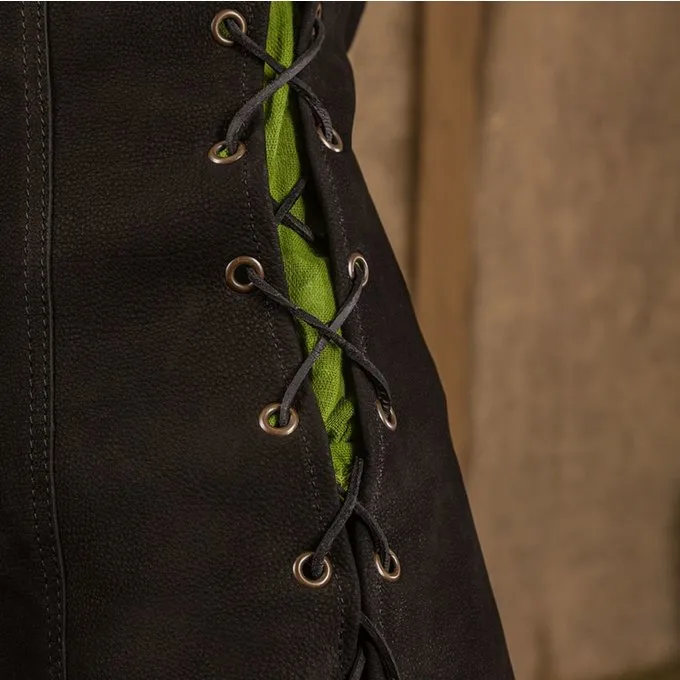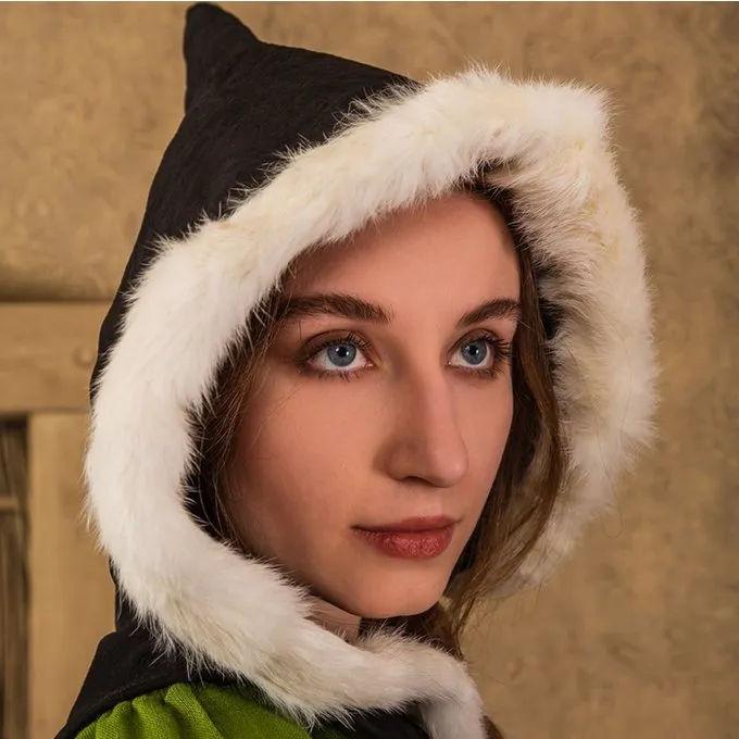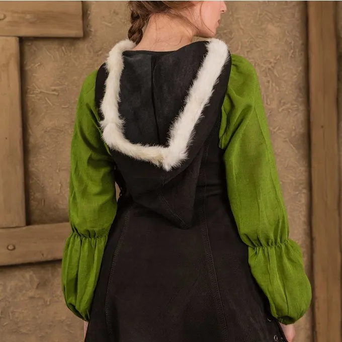 This unique dress is made of high quality vegetable tanned leather and rabbit fur. A beautiful dress for fantasy festivals and Cosplay! The dress has a hood trimmed with fur and laces for a tighter fit. You can combine this dress over a dress of your choice, so it is suitable for every season. The rabbit fur comes from organic breeders in Germany, no fur from factory farming or hunting has been used.
